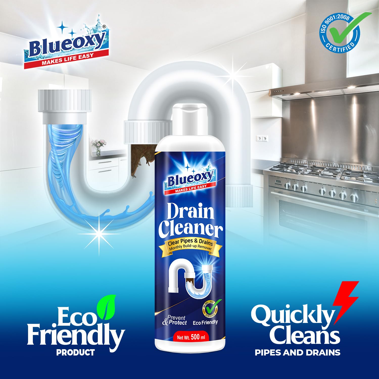 Blueoxy Drain Clog Remover Liquid | Used for Shower & Sink Drains & Pipes | Pure Gel Based | 500 Ml | Pack of 1