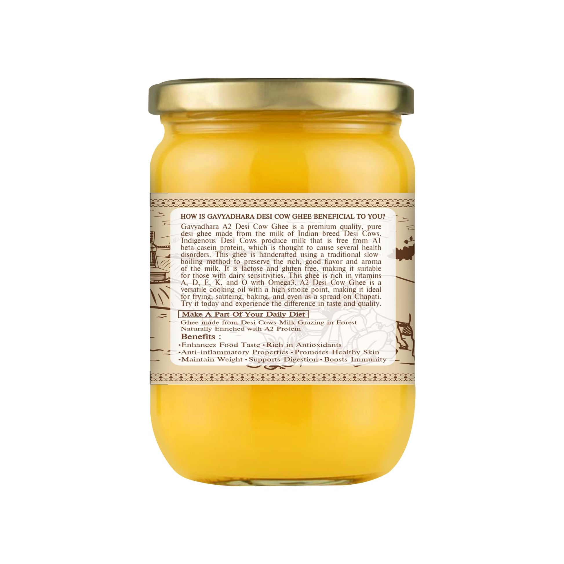 Details: HOW IS GAVYADHARA DESI COW GHEE BENEFICIAL TO YOU? Gavyadhara A2 Desi Cow Ghee is a premium quality, pure desi ghee made from the milk of Indian breed Desi Cows. Indigenous Desi Cows produce milk that is free from A1 beta-casein protein, which is thought to cause several health disorders. This ghee is handcrafted using a traditional slow-boiling method to preserve the rich, good flavor and aroma of the milk. It is lactose and gluten-free, making it suitable for those with dairy sensitivities. This ghee is rich in vitamins A, D, E, K, and O with Omega3. A2 Desi Cow Ghee is a versatile cooking oil with a high smoke point, making it ideal for frying, sautéing, baking, and even as a spread on Chapati. Benefits: Enhances Food Taste Supports Digestion Boosts Immunity Anti-inflammatory Properties Promotes Healthy Skin Rich in Antioxidants Maintains Weight Try Gavyadhara Desi Cow Ghee today and experience the difference in taste and quality.
