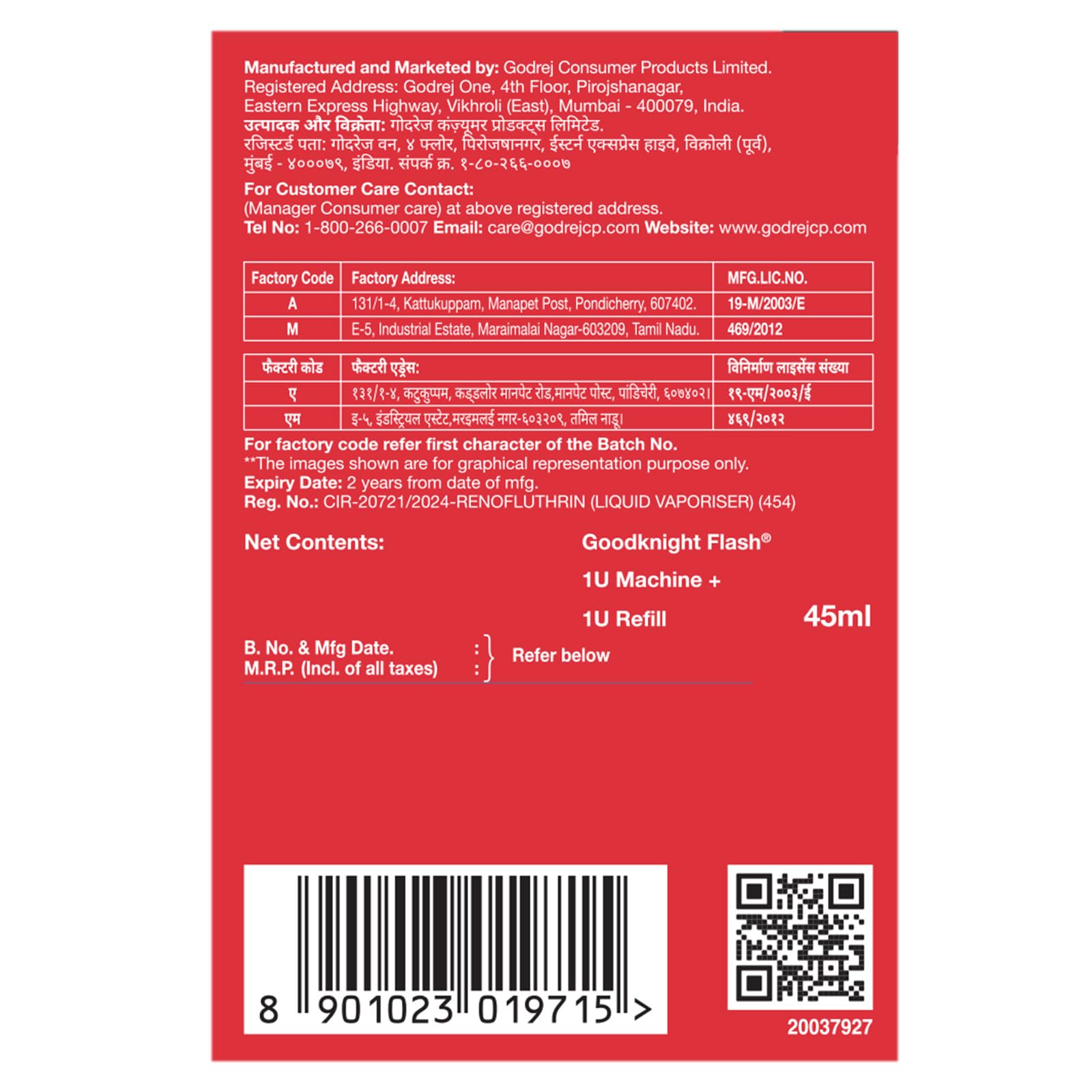- CONTAINS: 1 unit of electric plug-in Good knight Gold Flash machine and 1 refill of Good knight Gold Flash Liquid Vapourizer Mosquito Repellents Refill (45ml)