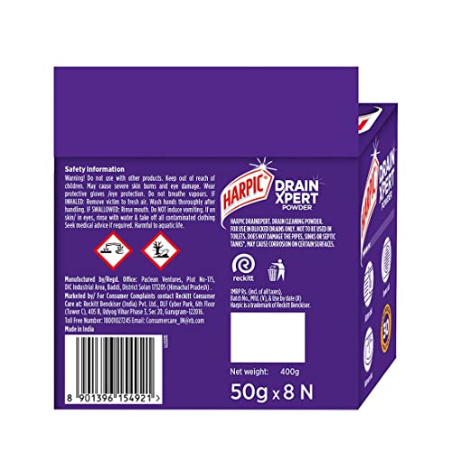 Harpic Drain Xpert Powder is a drain cleaning powder for use in blocked drains only. It melts grease and hair to unblock the drain pipe completely in 30 minutes. It does not damage the pipes, sinks or septic tanks. Can be used on all types of drains and pipes.