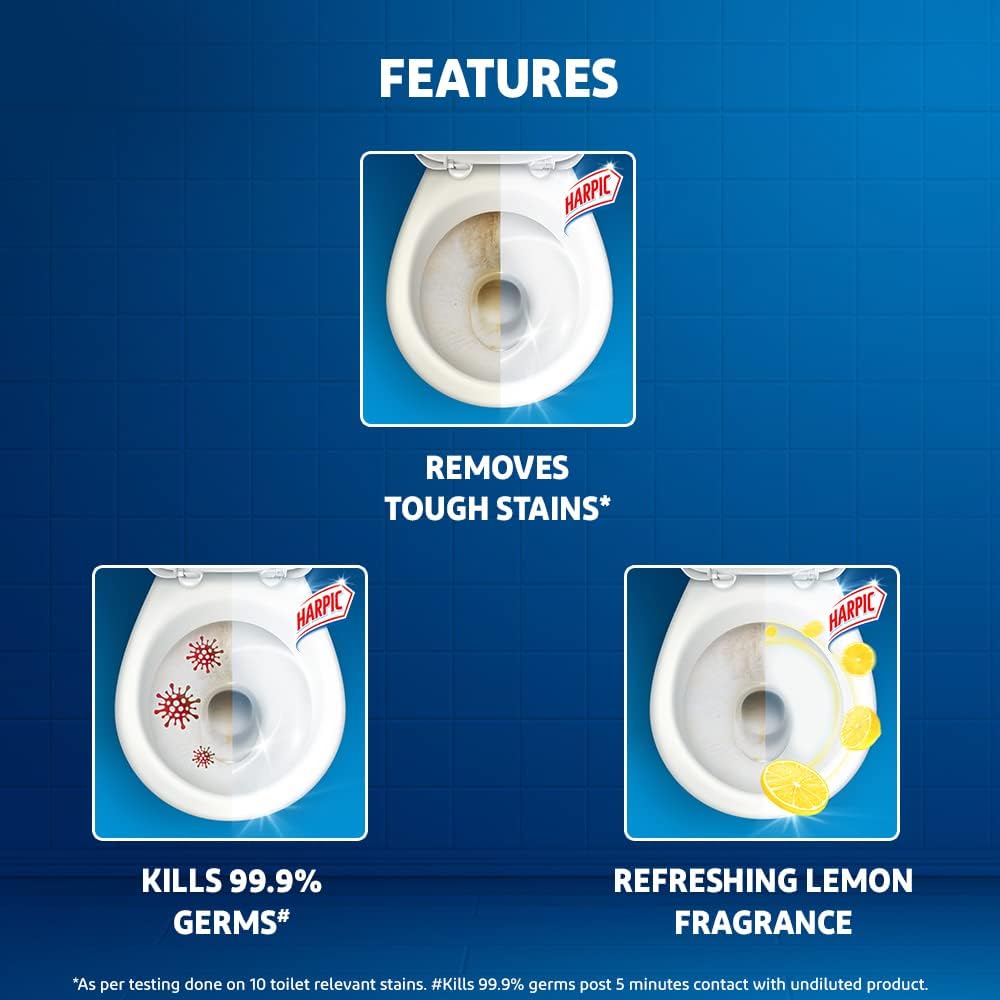 Harpic Disinfectant Toilet Cleaner is the one stop shop for all toilet cleaning needs. Unlike ordinary cleaners, it combines the benefits of Tough stain removal^, 99.9% germ kill and Freshness. The result is a sparkling clean, hygienic, fresh and germ free toilet without any malodour with every use of Harpic. 5x power action: 5 times better at lime scale removal VS ordinary cleaners, Helps eliminate mal-odour, Clings to attack stains, Kills all germs. India's #1 Toilet Cleaner*. Always use Harpic toilet cleaner separately. Do not mix with other products. *Reckitt Benckiser calculation based on data reported by NielsenIQ through its Retail Index Service for the Cleaners - Toilet Category, value for the 12-month ending June 30, 2022, for the India (U+R) market. (Copyright © 2022, NielsenIQ). ^Please refer to individual pack for details. #Kills 99.9% germs post 5 minutes contact with undiluted product.