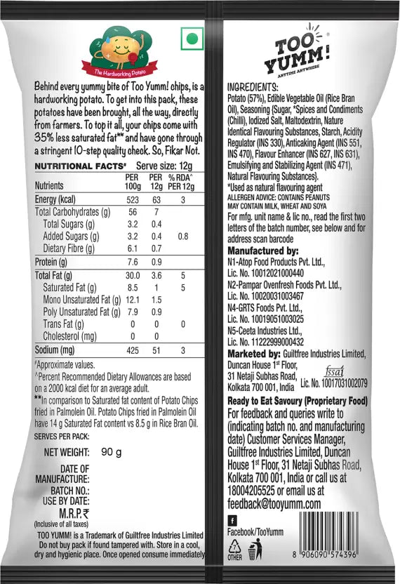 Experience the ultimate spicy indulgence with Too Yumm! Naagin Sauce Smoking Hot Bhoot Chips. Made with the fiery Naagin sauce, these chips are sure to set your taste buds on fire. With 90g of pure flavor, satisfy your cravings with a single bag.